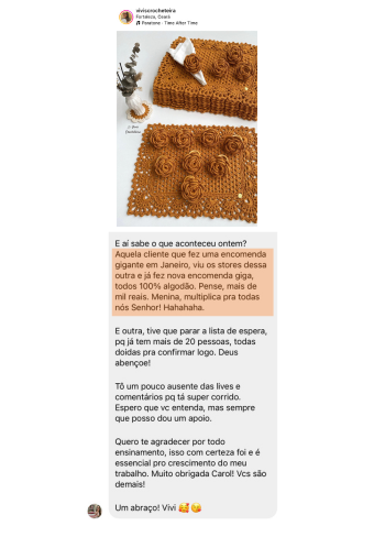 Essas crocheteiras são pessoas comuns, como você que apenas descobriram o potencial destas peças e hoje estão tendo muito resultado com a venda delas!