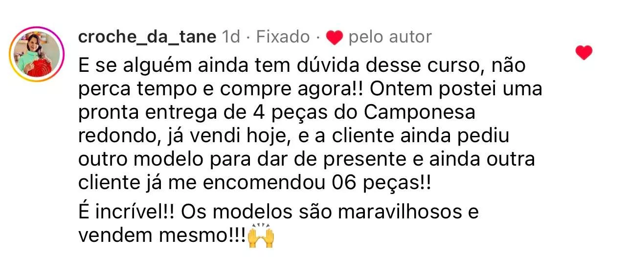 Não importa se você é uma crocheteira iniciante ou experiente, se estiver disposta a arregaçar suas mangas, você que conseguirá resultados extraordinários. É importante que você saiba que não é mágica, não é da noite para o dia e que não estou prometendo milagres. O crochê transformou a minha vida, mas foi através de muito trabalho e esforço! Eu já ajudei artesãs que estavam desiludidas, cansadas, e que tinham perdido as esperanças no crochê, e através do meu método, tecendo meus designs originais, hoje tem agenda lotada, milhares de seguidores, vendem suas peças a preços justos e são referências para muitas artesãs que estão na mesma situação.