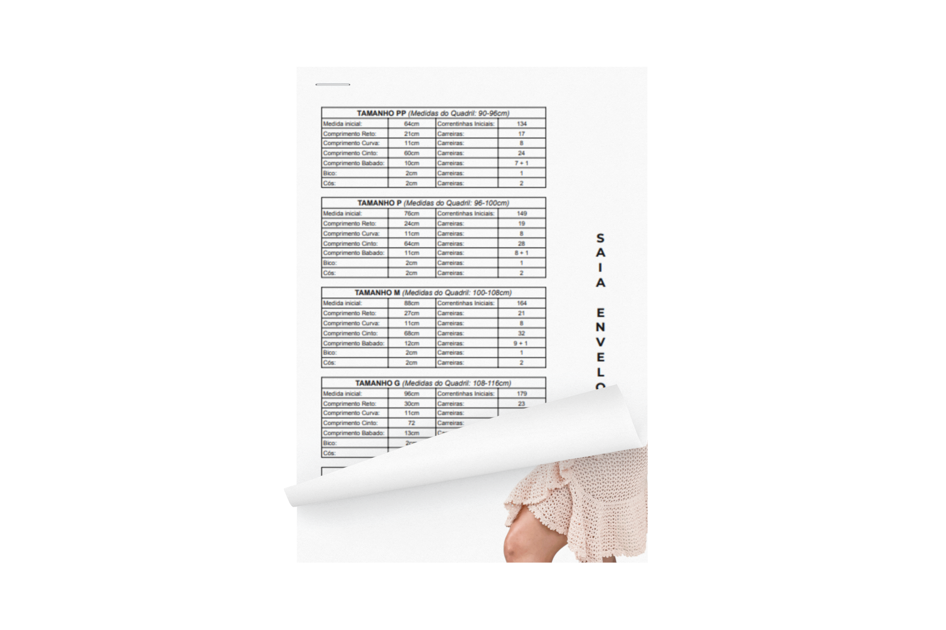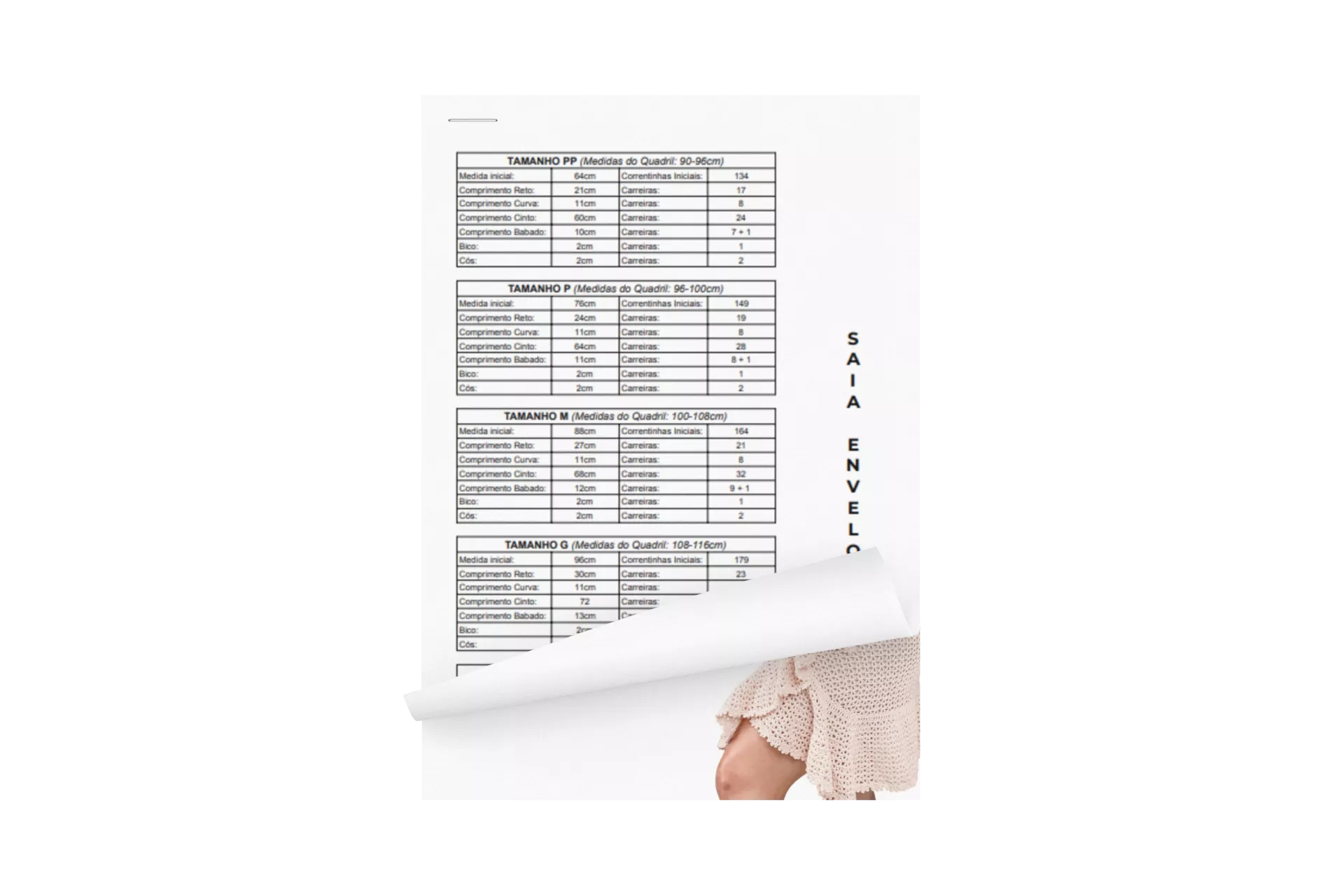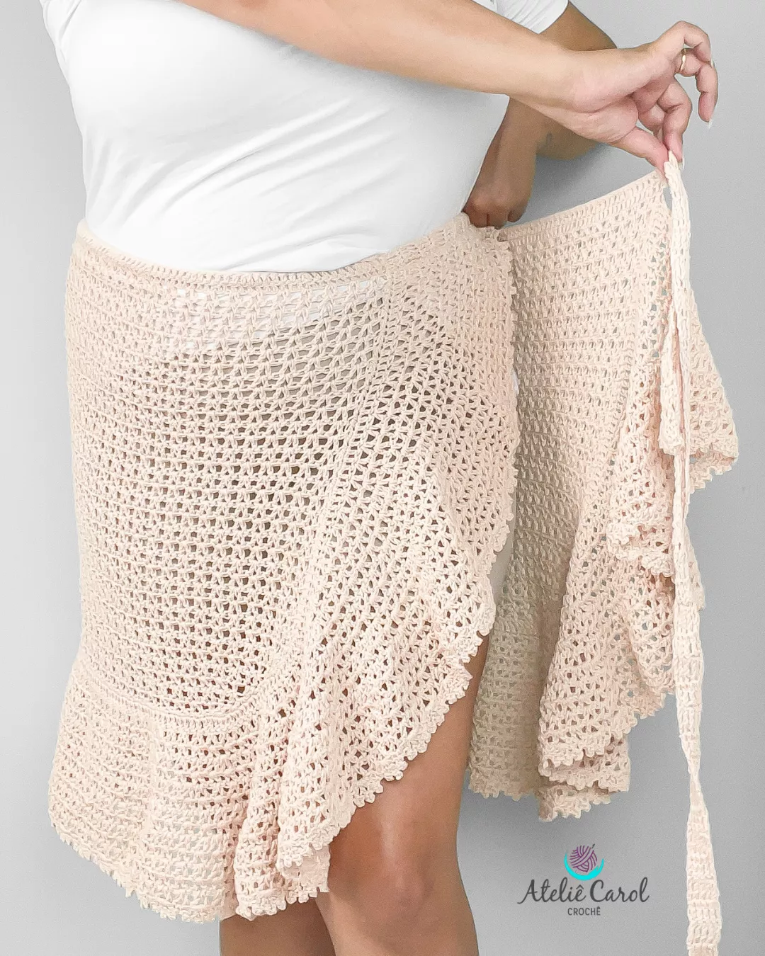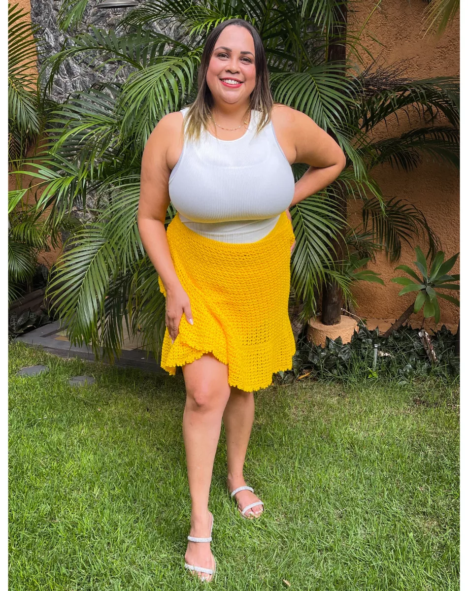 Nele você vai aprender a fazer 2 peças lindas em crochê para montar o seu próprio Look. A primeira peça é a saia envelope de babado, esse modelo é aberto na frente com uma sobreposição que se fecha de maneira elegante.